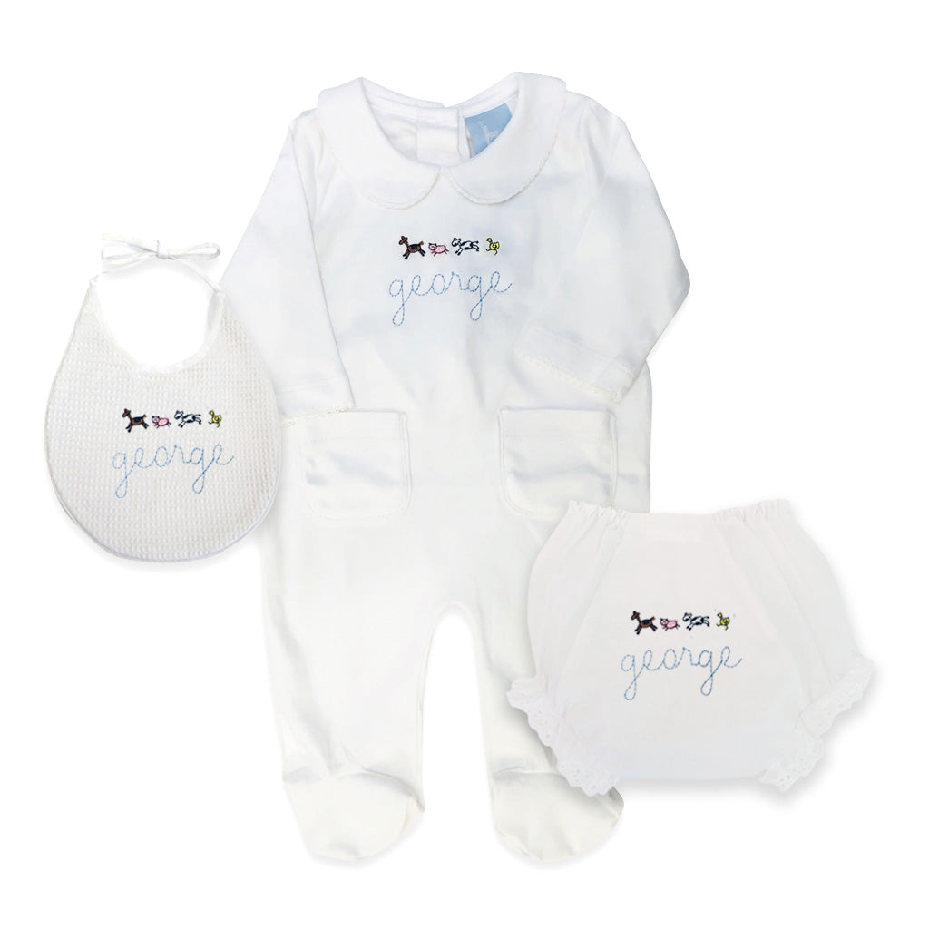 White with animal parade and stitched font / All sizes / Layette Gift Set - $ 38.00