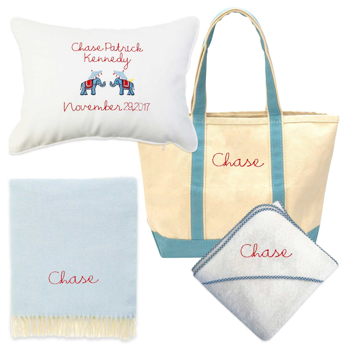 Essentials for the nursery. Featuring our hand stitched name on our canvas totes, hooded towel & blanket with elephants and birthday on the boudoir pillow!